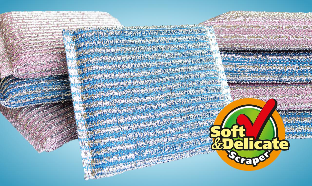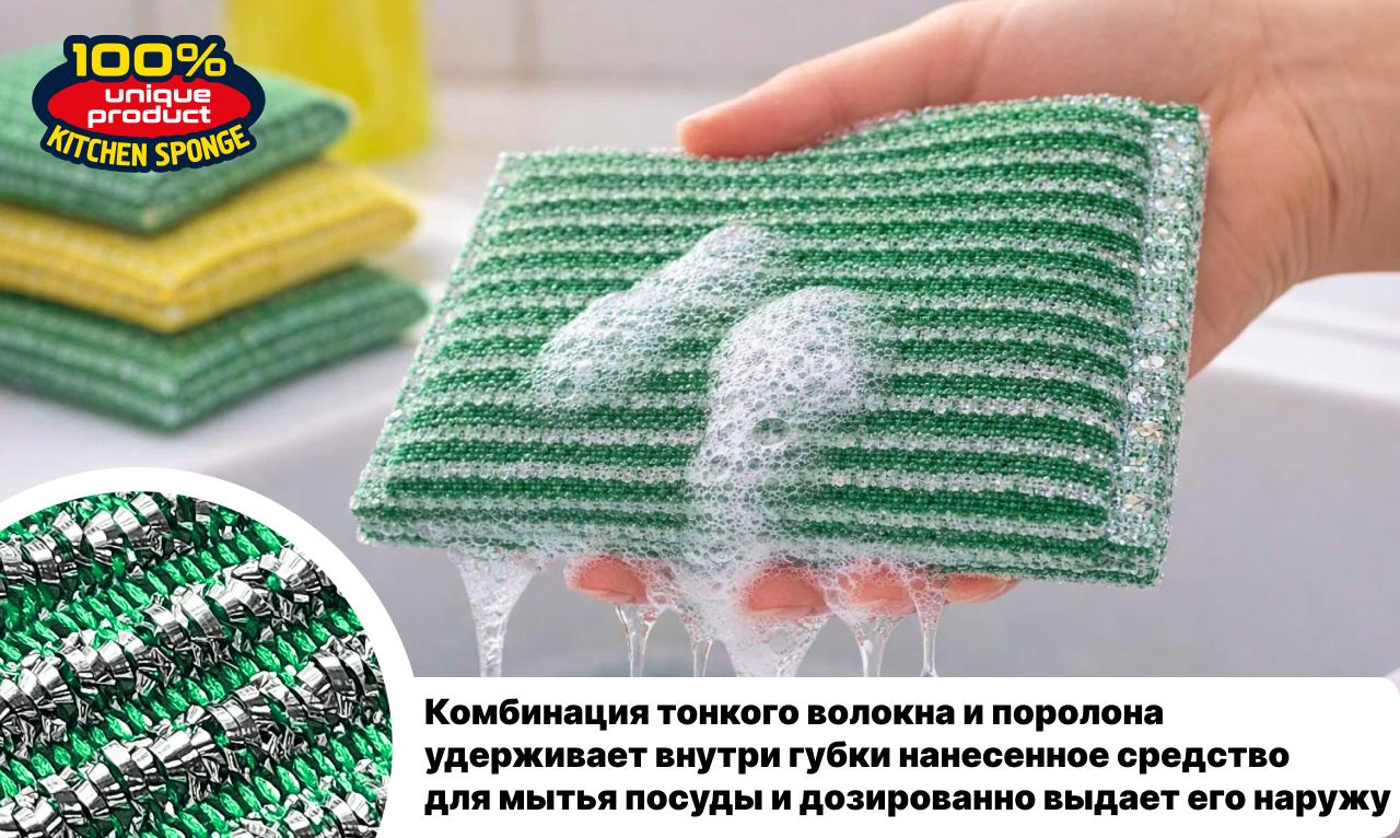 Имеет высочайшие потребительские свойства за счет тонких волокон полимера и плотного поролона. Комбинация тонкого волокна и поролона удерживает внутри губки нанесенное средство для мытья посуды и дозированно выдает его наружу.