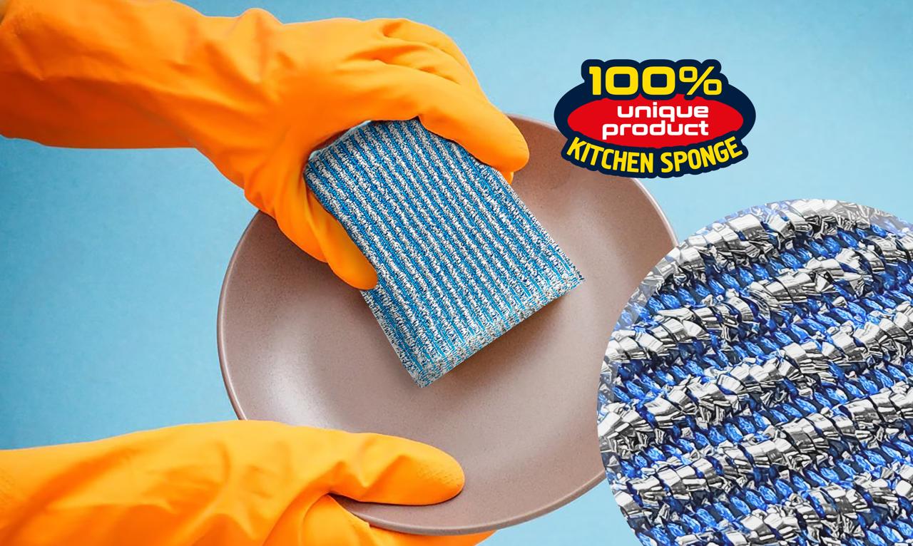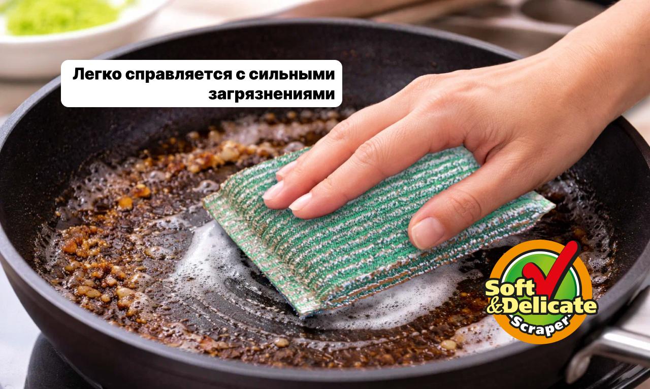 Универсальная губка-скрапер с плотным поролоном внутри прекрасно моет изделия из фаянса, стекла и столовые приборы.