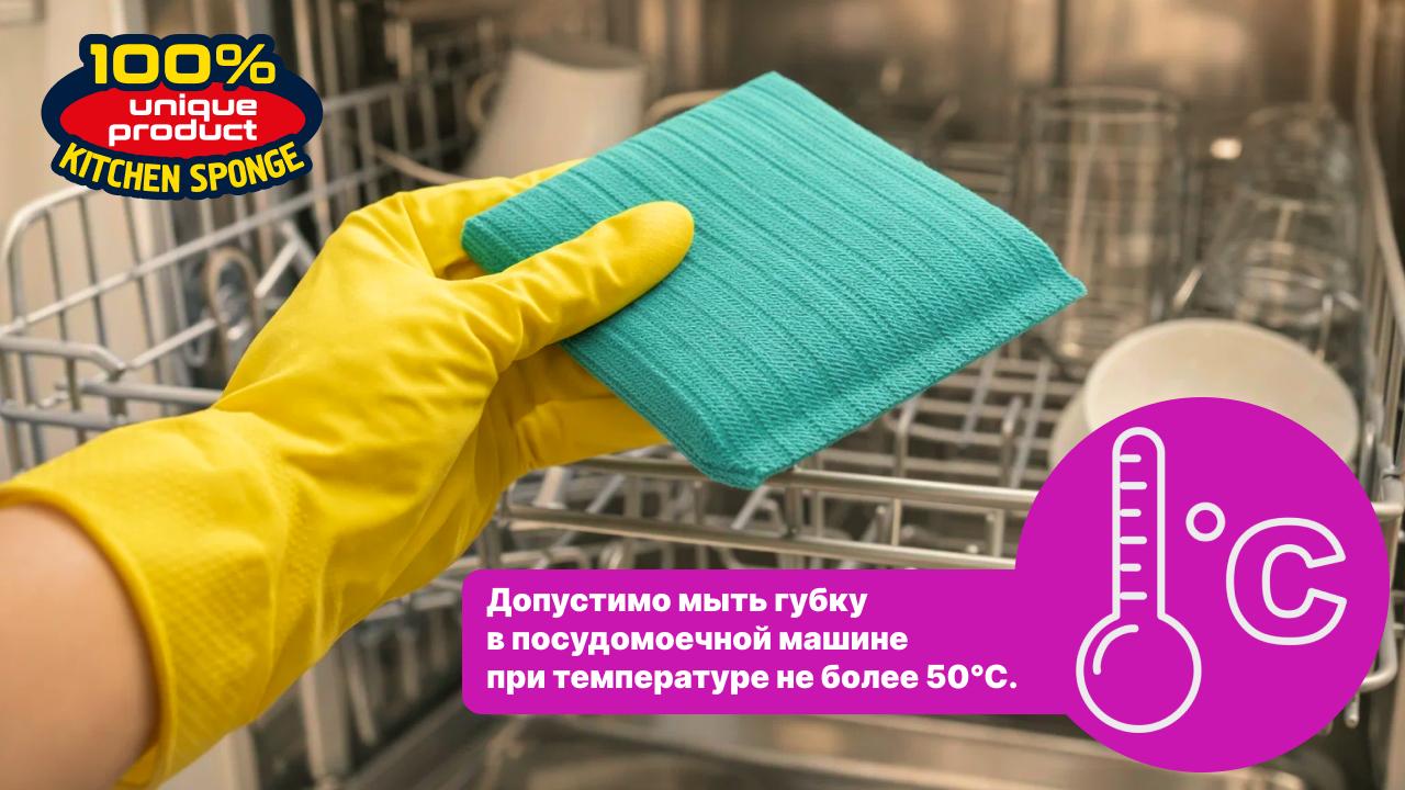 Допустимо мыть губку в посудомоечной машине при температуре не более 50°С.
